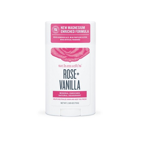 Schmidt s rose vanilla natural deodorants are scented with essential oils are aluminum free without alcohol coconut oil propylene glycol parabens phthalates.