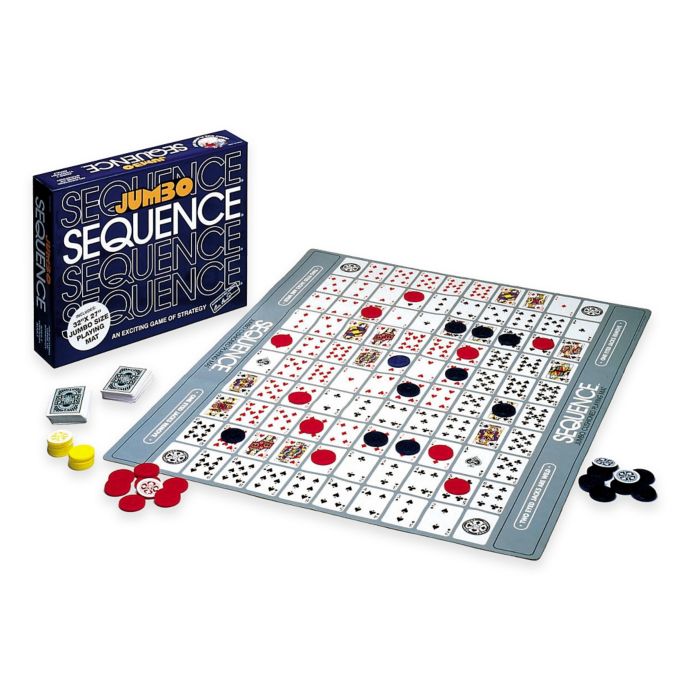 Jumbo sequence is a game of strategy played on a colorful cushioned vinyl playing mat 32 by 27 inches.