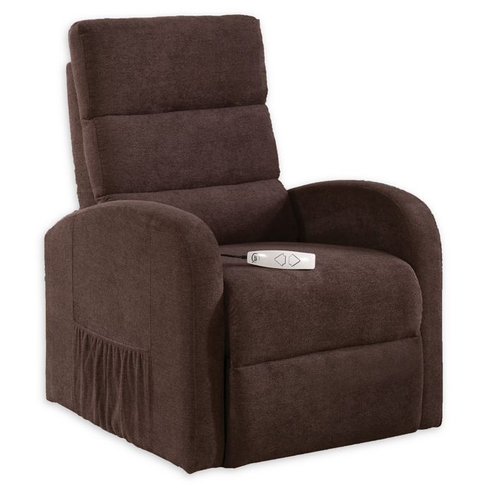 Brown soft fabric upholstery power lift chair with remote.